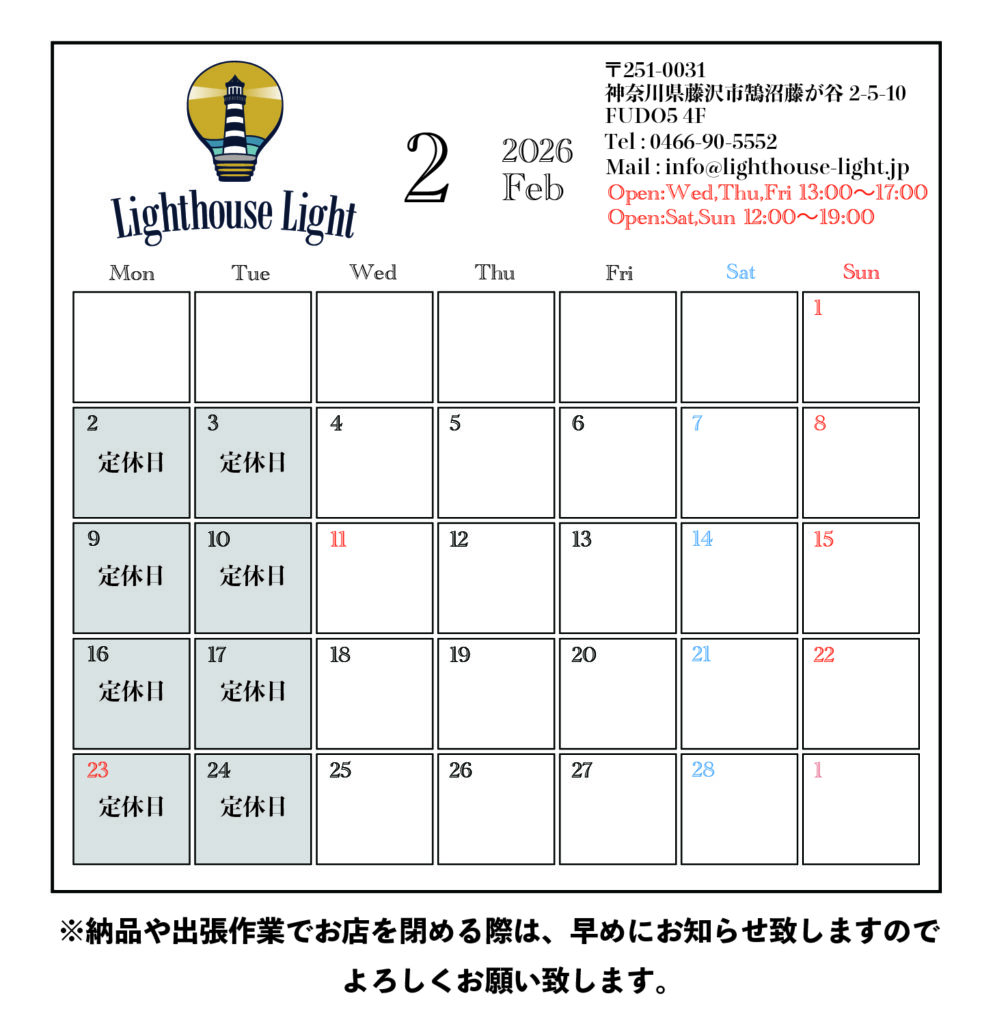 〜2月の営業スケジュールはこちら〜 2026.02.01 ショップからのお知らせ 今月は営業時間での納品などは現在ございませんので、通常通りの営業を進める予定です。 ただ現地打合せが入る予定ですので、営業日に入る場合は早めにお伝え致します。 納品や出張作業でお店を閉める際は、早めにお知らせする様にしますので、気になる方はInstagramのストーリーや投稿をご覧になってくださいね。 修理依頼のお預かりが増えているのですが、新商品も並行して出していけるように努めてまいります。 ※お店のポストとドア前には更新したカレンダーを貼っています。